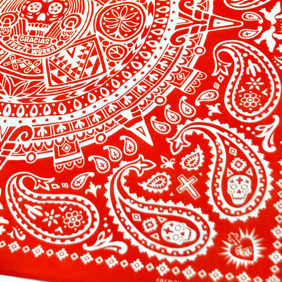 太陽の石、アステカカレンダーの図柄を元にFRENZY WORKSでアレンジしたこオリジナルデザインバンダナです。ペイズリー部分にメキシカンスカルやトリがいたり、カレンダー部分には文字、ピースマークやエスニック柄などを描き込み、細部までこだわってデザインを作りこんだバンダナ柄です。