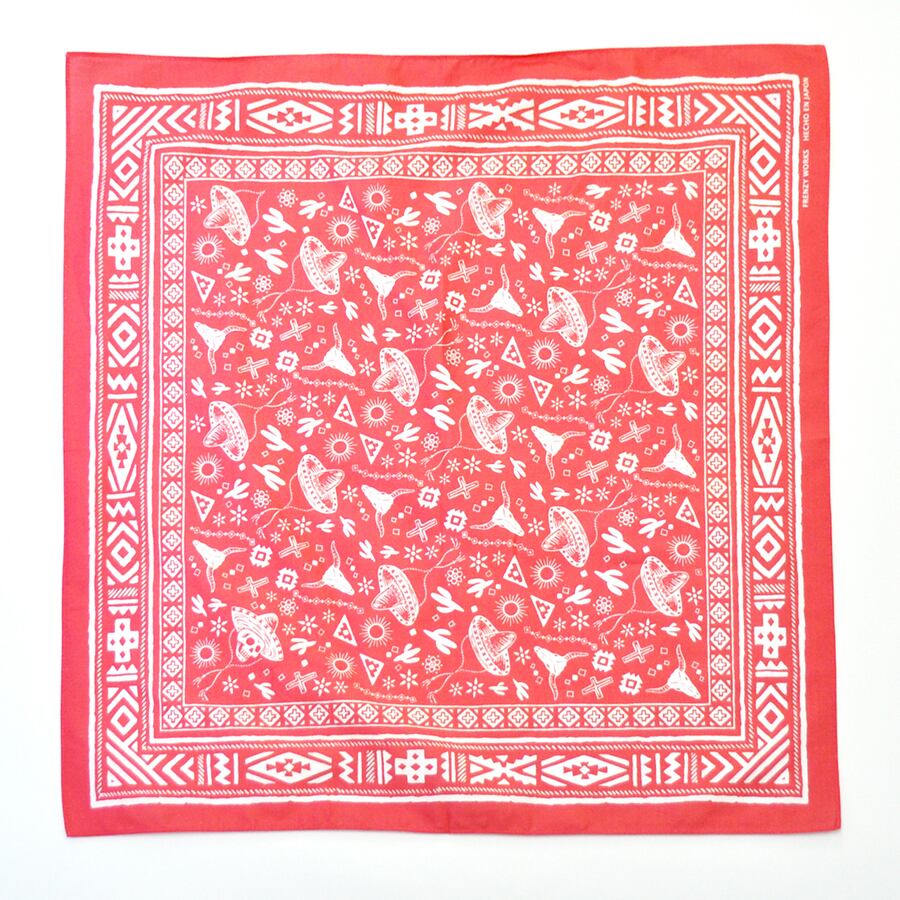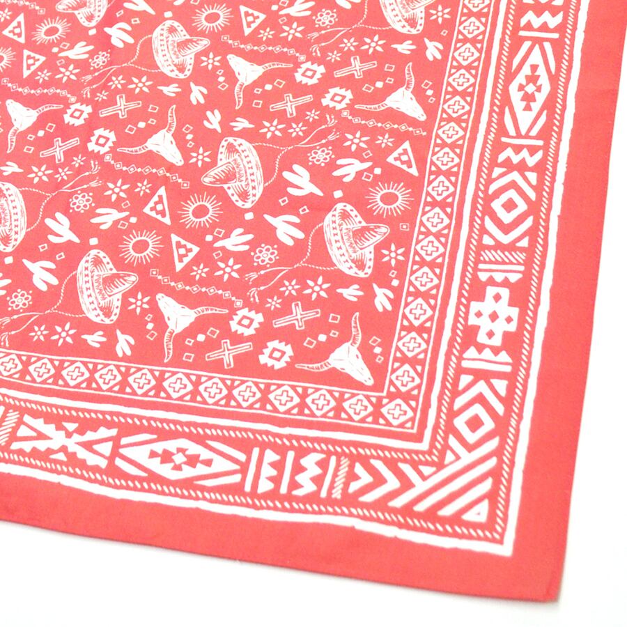 エスニックな模様の枠にソンブレロや牛の骨やスカルがプリントされたバンダナです。