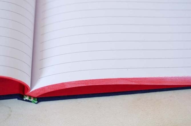 毎日持ち歩いたりしても、しっかりとした表紙なので最後のページまで、綺麗な状態で使っていただけます。角の形やサイドの色、罫線の色にもこだわった伝統的な手作りのノートです。