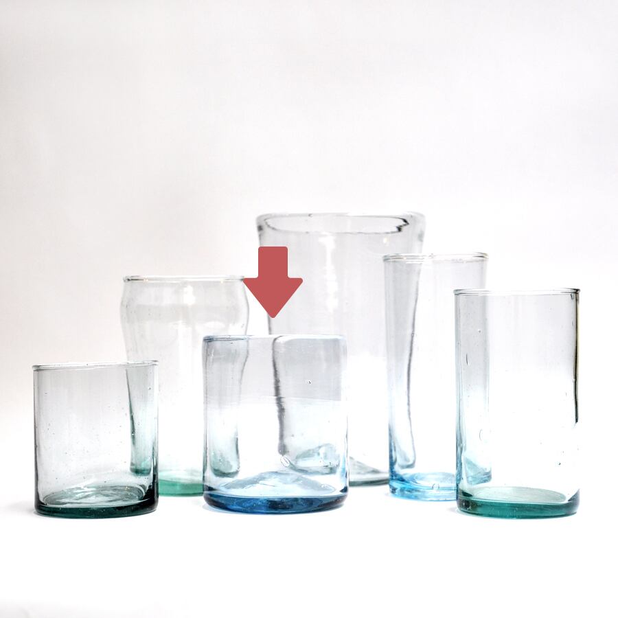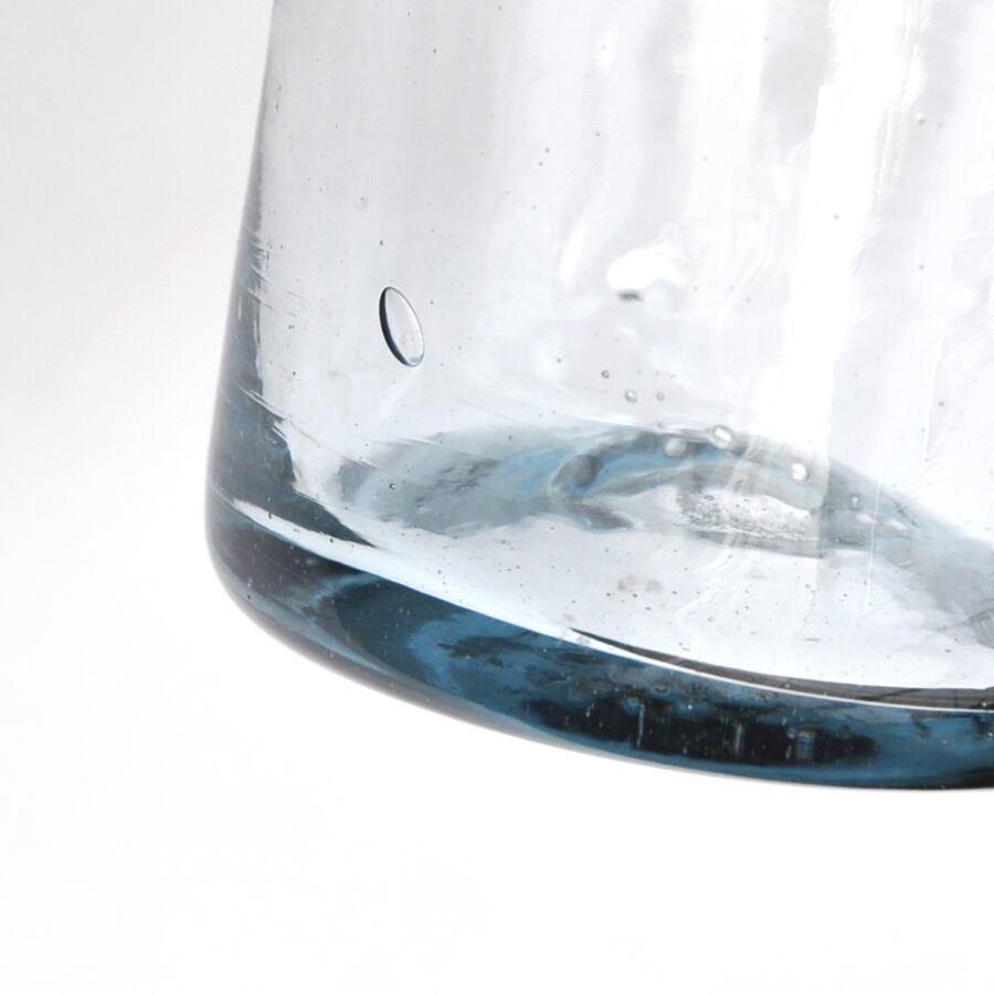 プエブラ州で80年続く老舗工房で作られるガラス製品です。昔ながらの手吹きの製法で作られるガラスは、不規則に並ぶ気泡や、微かに歪んだフォルムが、手作りならではの味です。ガラスの厚みやサイズもひとつひとつ異なり、全く同じものは存在しません。