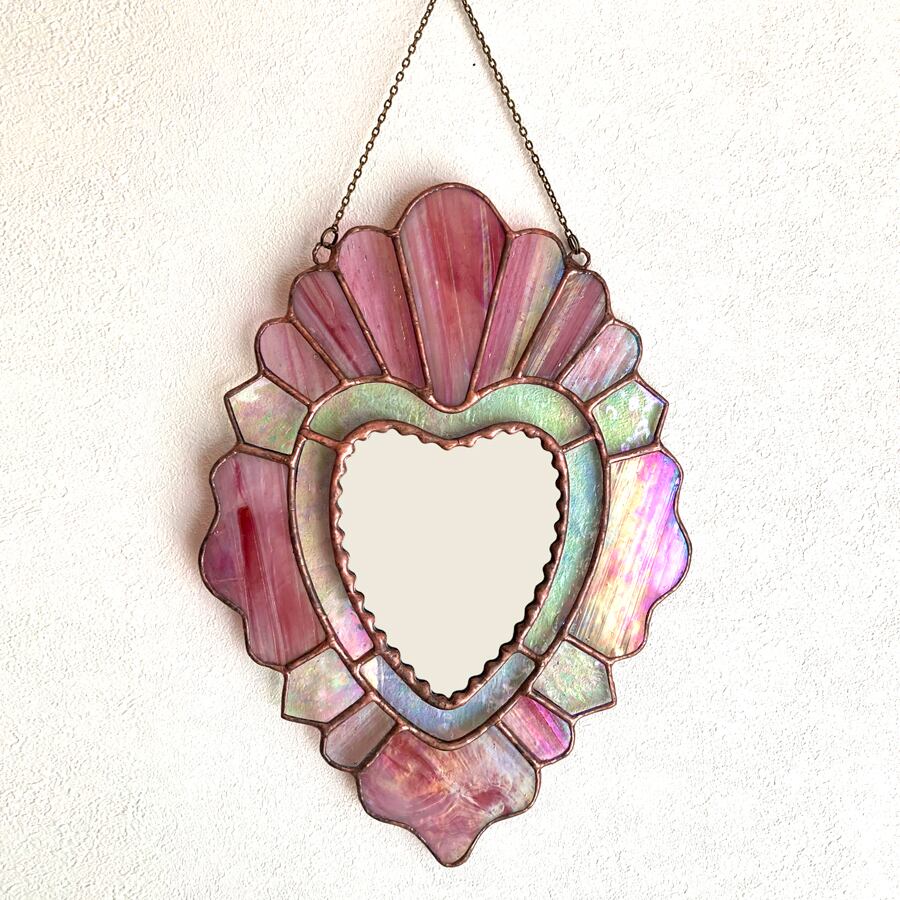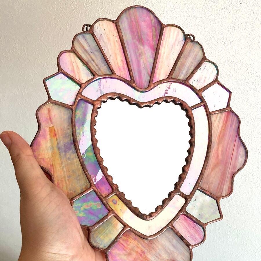 ハートの形をしたステンドグラスの鏡です。